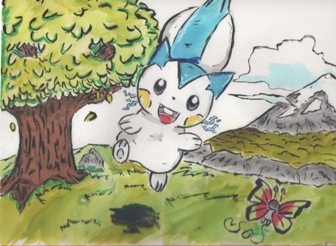 Tout d’abord le Pachirisu de Dr#Reshini ! Il/elle a su représenter la gaieté du pokémon et un fond simple mais qui a beaucoup d’impact ! j’aime beaucoup les couleurs et le style de trait que tu as servi pour la montagne et le nuage derrière ! en plus il y a un prismillon dans le décor ! pour voir la galerie de Dr#Reshini cliquez ici