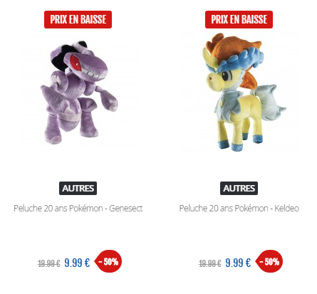 Niveau peluche, -50% sur celle de Ronflex, Meloetta, Keldeo et Genesect, qui pour ces 3 derniers appartiennent à la collection de peluche des 20 ans de Pokémon sortie l’an dernier. Ainsi, si vous n’avez pas encore réussi à compléter votre collection, c’est le moment !