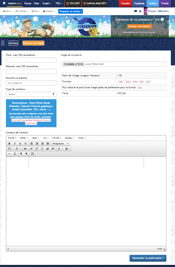 C’est tout simplement un système qui vous permettra de proposer du contenu au site sans intégrer le staff. Que ce soit des tutoriaux, des articles news (TCG, jeux vidéo, animé …) mais aussi des strips … Pour résumer tout ce qui peut être rédigé sous forme d’article.