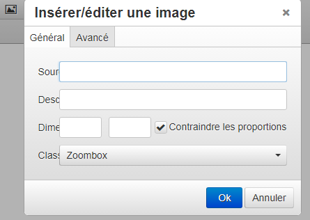 . Une boite de dialogue s’ouvrira et vous devrez y mettre le lien de l’image que vous voulez insérer dans l’article dans la première case « source ». Il vous faudra donc les uploader sur un hébergeur extérieur. Pour des raisons de sécurité évidentes, nous ne pouvons pas vous permettre d’uploader sur le site comme le font les rédacteurs de l’équipe.