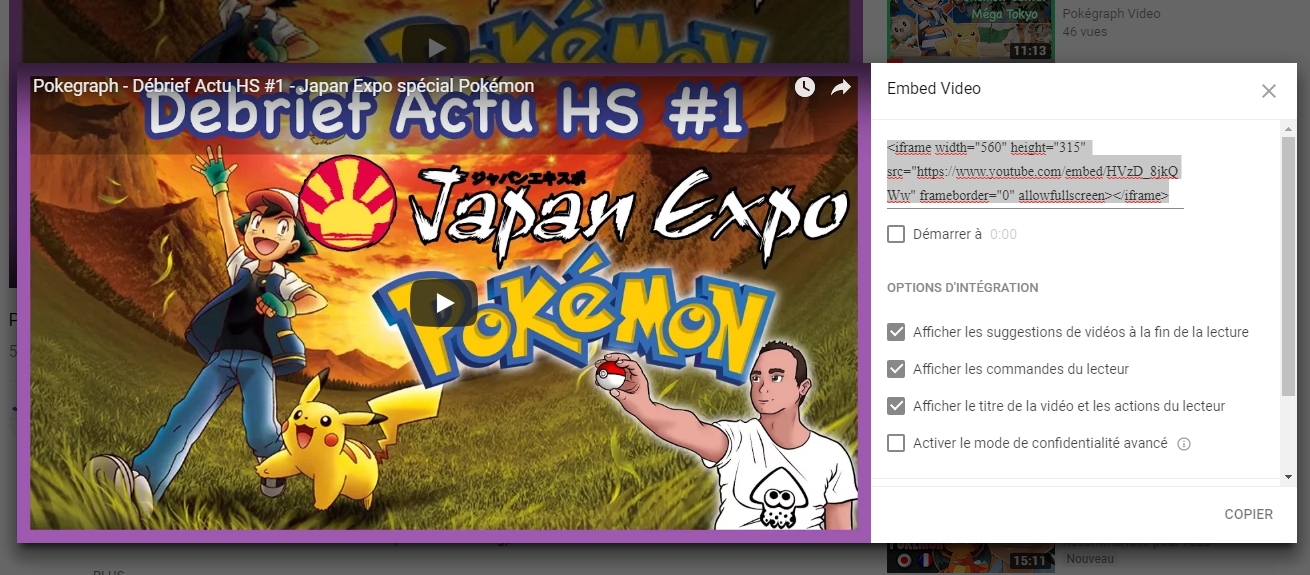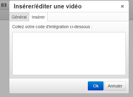 Vous aurez juste à coller le code d’intégration de la vidéo. Sur Youtube vous les obtenez en cliquant sur partager puis intégrer. Copier coller le code donné dans la fenêtre qui s’ouvrira comme vous le voyez sur le screen ci-dessous (surligné en gris pour l’exemple).