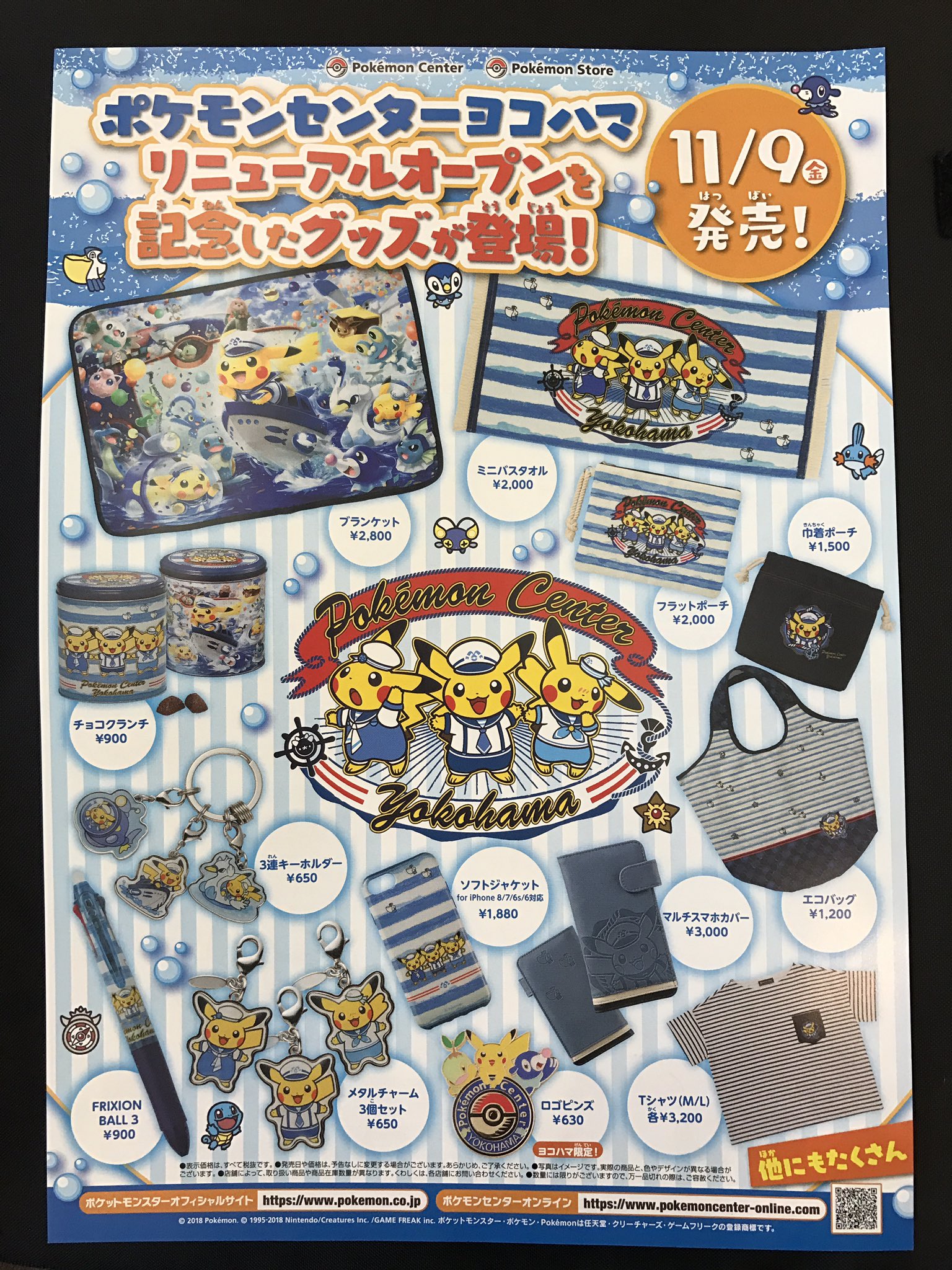 Voici une affiche qui annonce une collection spéciale pour le Pokémon Center de Yokohama pour le mois de Novembre ! Cette collection tournera autour de Pikachu et de la marine, cette ville est très connue pour l’activité importante de son port.