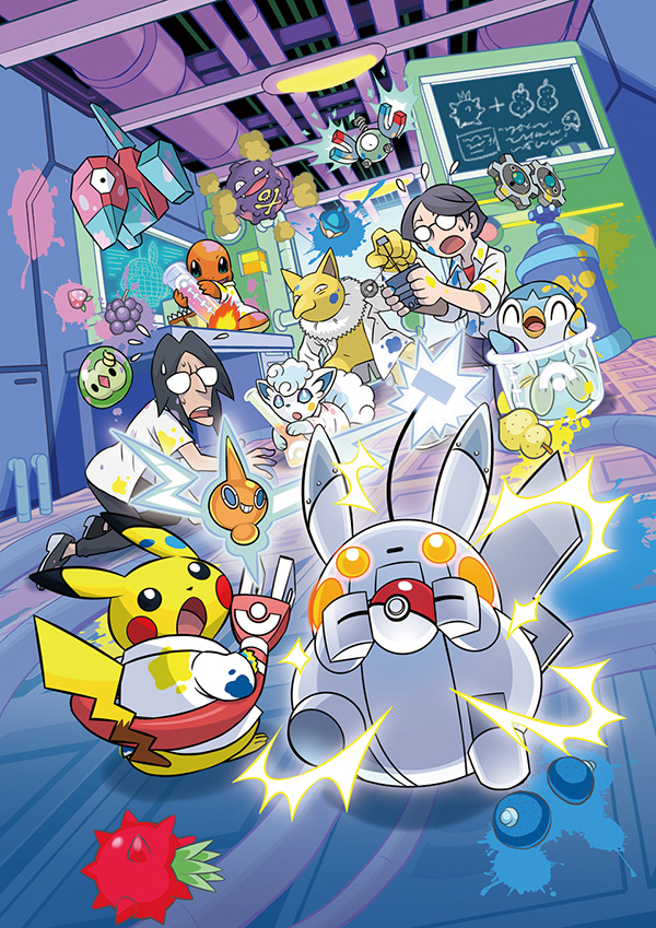 Cette collection a été inspirée par … un dresseur figurant dans Soul Silver et Heart Gold sur DS ! Il s’agit d’un scientifique possédant un robot Pikachu mais ici, il semblerait qu’un Motisma un peu joueur se soit faufilé dans le Robot, heureusement ces scientifiques ont d’autres Pokémon pour les assister.
