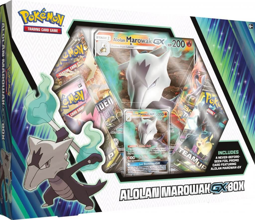 Chaque boîte contient : 1 carte brillante d’un Pokémon-GX : Dracaufeu-GX, Léviator-GX ou Raichu-GX, 4 boosters de Destinées Occultes du JCC Pokémon, 1 carte à code du JCC Online