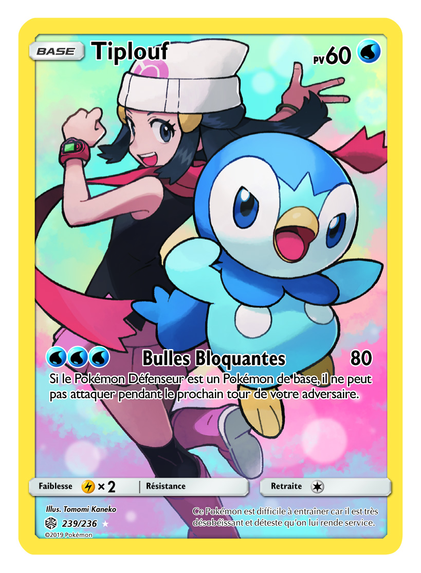 Soleil et Lune – Éclipse Cosmique accueillera deux nouveaux trios ESCOUADE, les Pokémon fabuleux et légendaires Arceus, Dialga et Palkia-GX, ainsi que les mignons (mais puissants) Togepi, Mélo et Toudoudou-GX. Cette extension proposera aussi de nouvelles cartes Supporter ESCOUADE avec deux personnages, tels que Red et Blue ou Cynthia et Percila, sur la même carte. Vous trouverez aussi des versions spéciales de certaines cartes, agrémentées d’illustrations de Pokémon avec leur Dresseur.