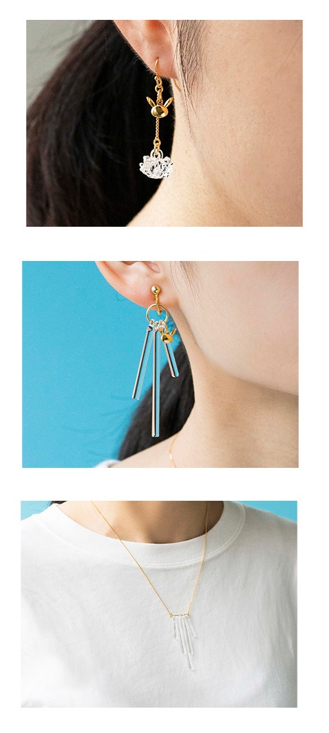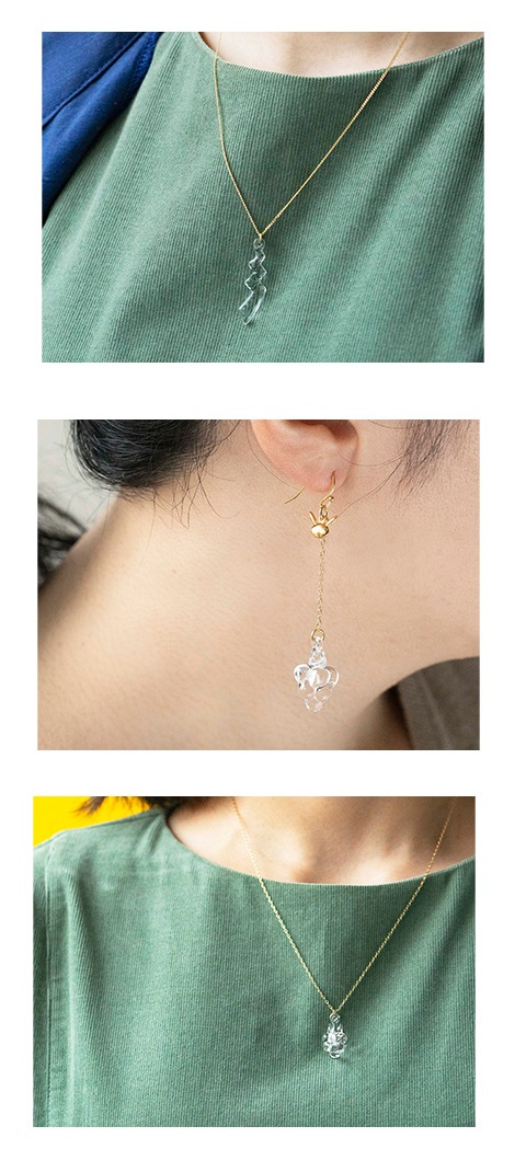Voici des bijoux en verre réalisé en collaboration avec le verrier HARIO, cette entreprise a d’abord fabriqué du verre pour des lampes puis s’est lancé dans la fabrication d’accessoires et de bijoux. Disponible le 7 décembre 2019