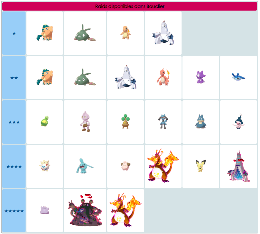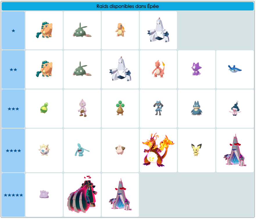 Voici un récapitulatif des Raids qui sont actuellement disponibles sur Pokémon Epée et Pokémon Bouclier (merci à Eternia pour les tableaux).