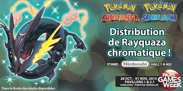 En effet, la firme japonaise a annoncé aujourd’hui que lors de cet événement, seront distribués des Rayquaza Chromatiques ! Et il faut dire que le légendaire était attendu en France. L’Angleterre, les Etats-Unis, l’Allemagne, l’Australie et, bien sûr, le Japon en avaient déjà profité suite à des distributions.