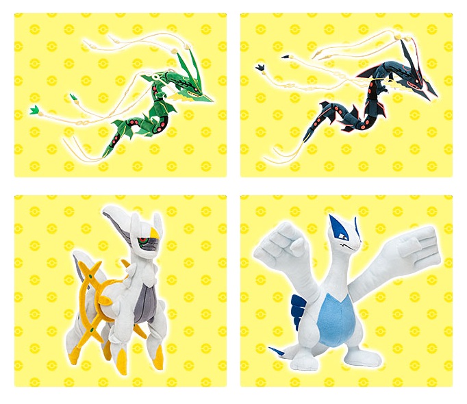 Des peluches de légendaire avec Mega Rayquaza normal et shiny, Arceus et Lugia