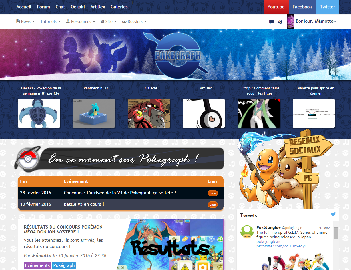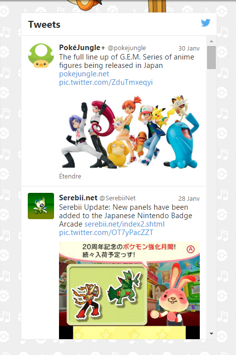 Concernant Twitter, ce sont des tweets que nous mettons dans nos favoris pour vous transmettre des informations venant d’autres sites, ce qui permettra de compléter les news que nous rédigerons sur Pokégraph. Nous organiserons parfois des distributions de codes, vous pourrez aussi les voir dans cet aperçu. Par défaut vous verrez les 20 derniers tweets mais il suffit de cliquer sur « afficher plus » pour en voir d’autres.