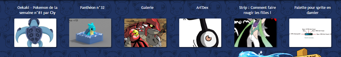Dans ce bandeau bleu avec notre super pattern fait maison, vous aurez accès à toute la partie art. Les miniatures se mettront à jour à chaque nouvelle publication (sauf pour les galeries pour le moment). Il suffira de cliquer pour voir la news ou le dessin correspondant.