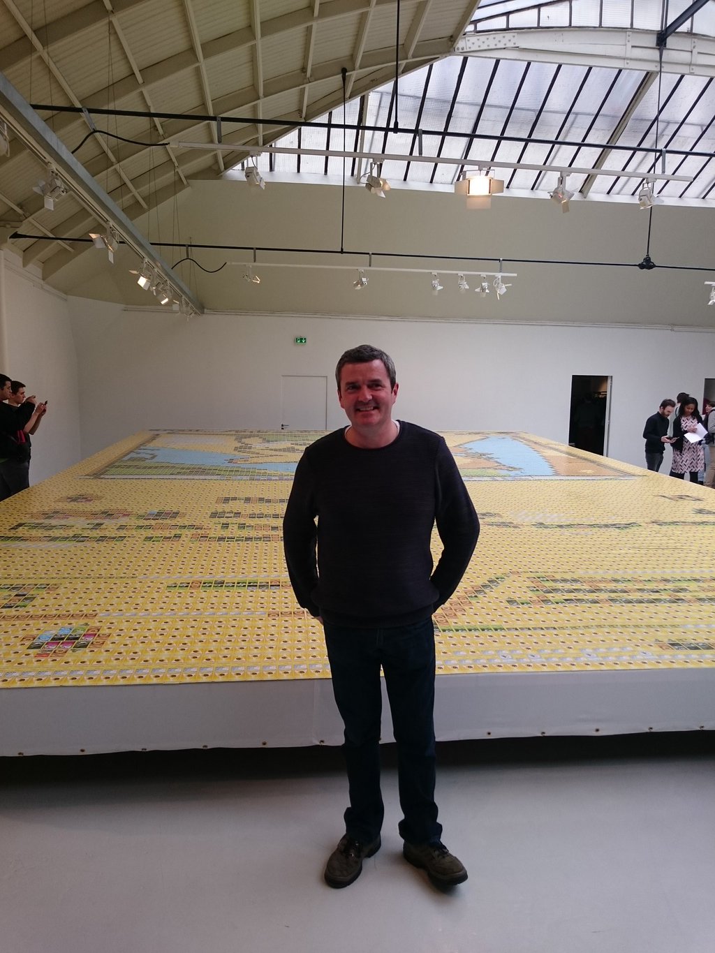 Il m’a dit aussi hors-interview pour acheminer la mosaïque, il a dû coller ces cartes une après l’autre avant de l’enrouler dans sa toile pour le transporter jusqu’au lieu d’exposition.