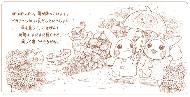 Petite catégorie pour vous reparler des Pikachu du mois de Juin, deux petit Pikachu dans leur parkas sous un parapluie Morpheo.