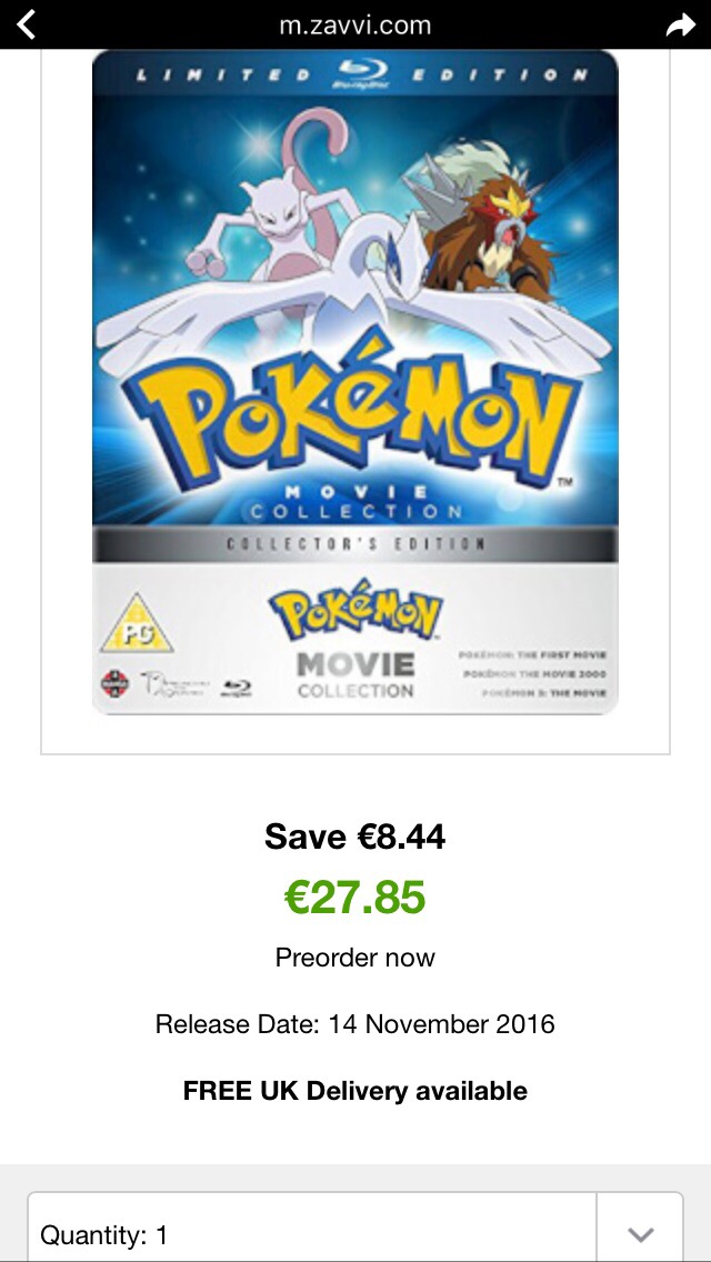 Mais ce n’est pas tout, également annoncé, mais cette fois ci pour nos amis anglais ( j’espère qu il sortira en France sinon faudra le commander là bas :p), un coffret de la première trilogie Pokémon ( Mewtwo contre Mew, Le Pouvoir est en toi et Le Sort des Zarbi) mais en édition limitée Steelbook et en Blu-Ray au prix de 27.85€ avec une sortie le lundi 14 novembre 2016 d’après le site zavvi.com