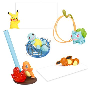 Pikachu vous tiendra vos petits mots, Salamèche vos stylos, Bulbizarre les élastiques quant à Carapuce, il attirera les trombones et Evoli dormira sur vos papiers ! Disponible chez Gashapon.