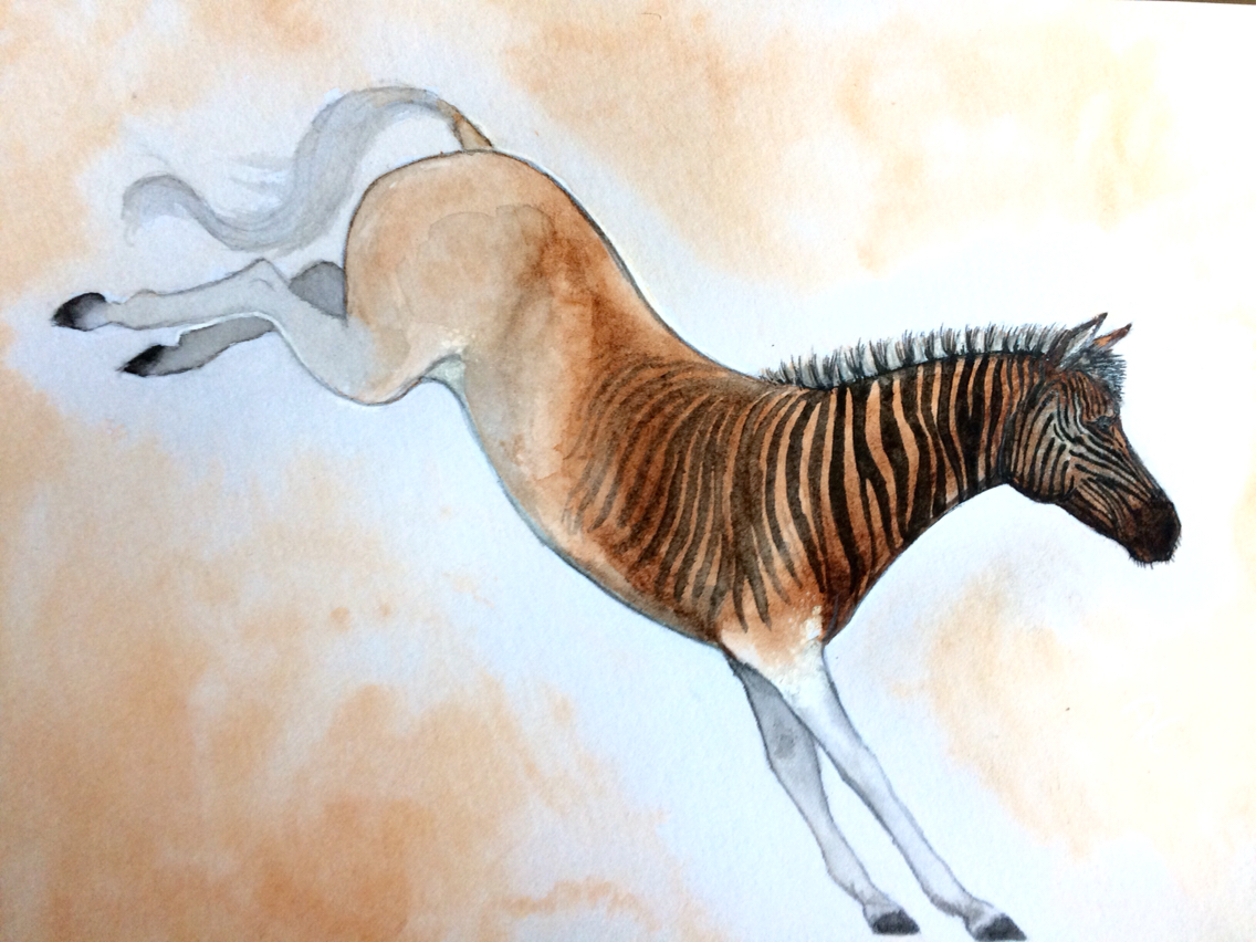 Non, ce n’est pas un nouveau cocktail que l’on sert dans les bars branchés, il s’agit d’un animal qui a réellement existé mais éteint de nos jours. Passionnée par les chevaux, Démanciel nous en offre là une représentation superbe, magnifiée à l’aide de l’aquarelle. La pose est dynamique, les lignes ont l’air toute douces et l’anatomie parfaite (et pour galérer à dessiner les cheveux je sais de quoi je parle u_u )