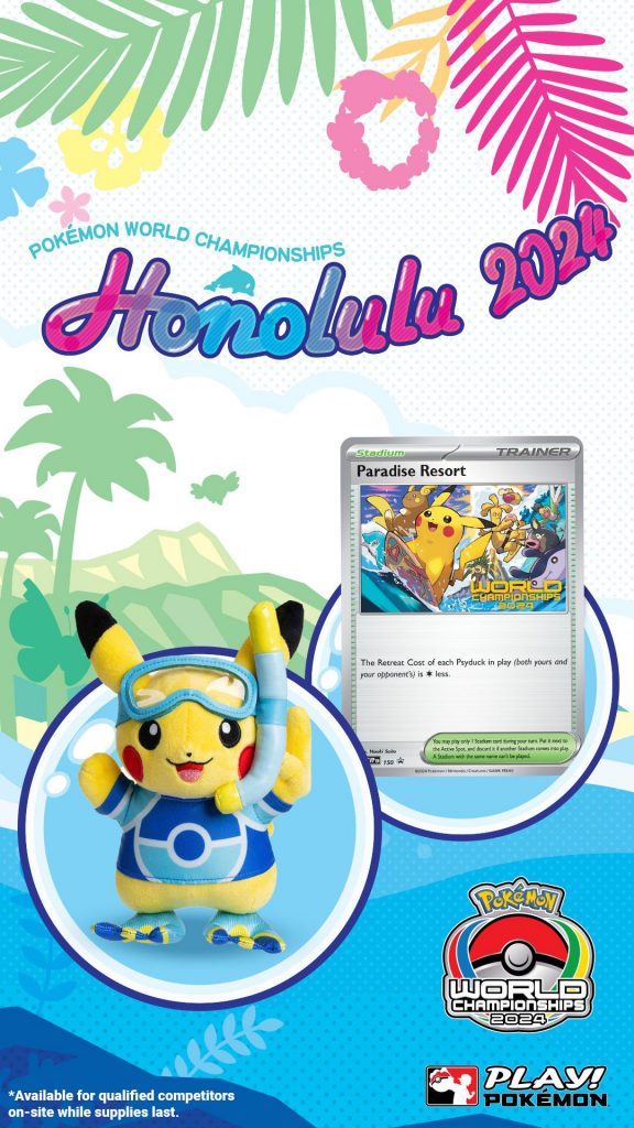 Ces deux articles feront partie du kit de bienvenue que recevront les compétiteurs qualifiés pour les Championnats du Monde. Par ailleurs, la peluche Pikachu sera disponible uniquement à la boutique temporaire Pokémon Center des Championnats du Monde Pokémon 2024.