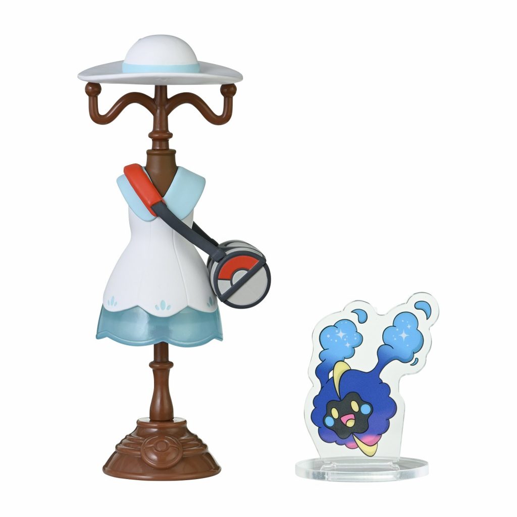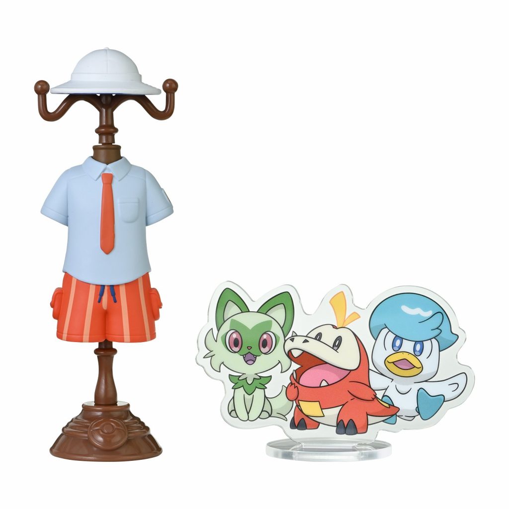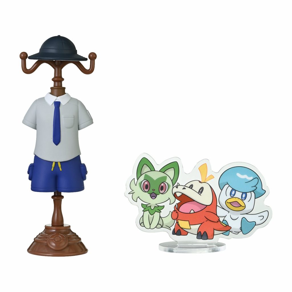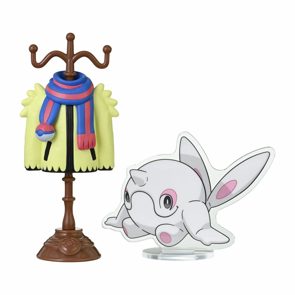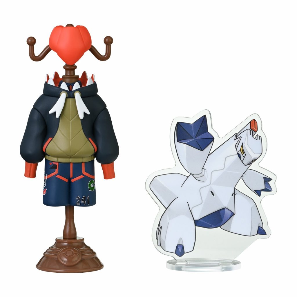 L’ensemble comprend une figurine inspirée des costumes portés par certains Dresseurs emblématiques et un support en acrylique représentant un Pokémon.