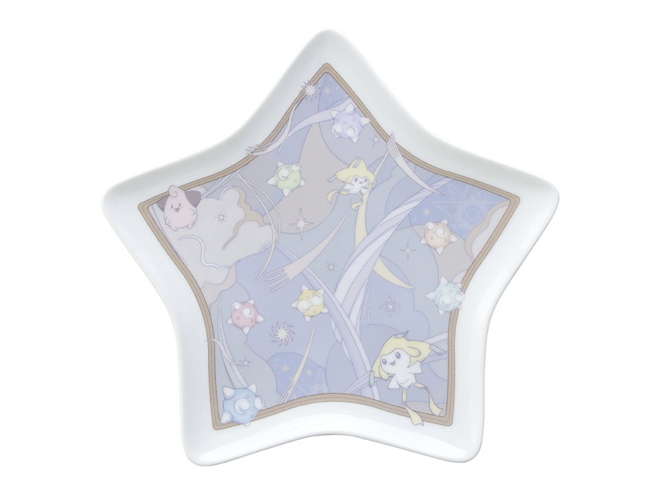 Melo et Météno accompagnent Jirachi sur les illustrations de la collection Pokémon Jirachi Hoshi Tsunagi. La gamme comprend une peluche et une mascotte de Jirachi qui brillent dans le noir. Vous trouverez aussi des assiettes et des boîtes en verre en forme d’étoile ! De plus, il existe d’autres produits faciles à utiliser dans la vie de tous les jours, comme une pochette, un miroir, cuillère, tote bag, étui, couverture, housse de coussin, classeur…