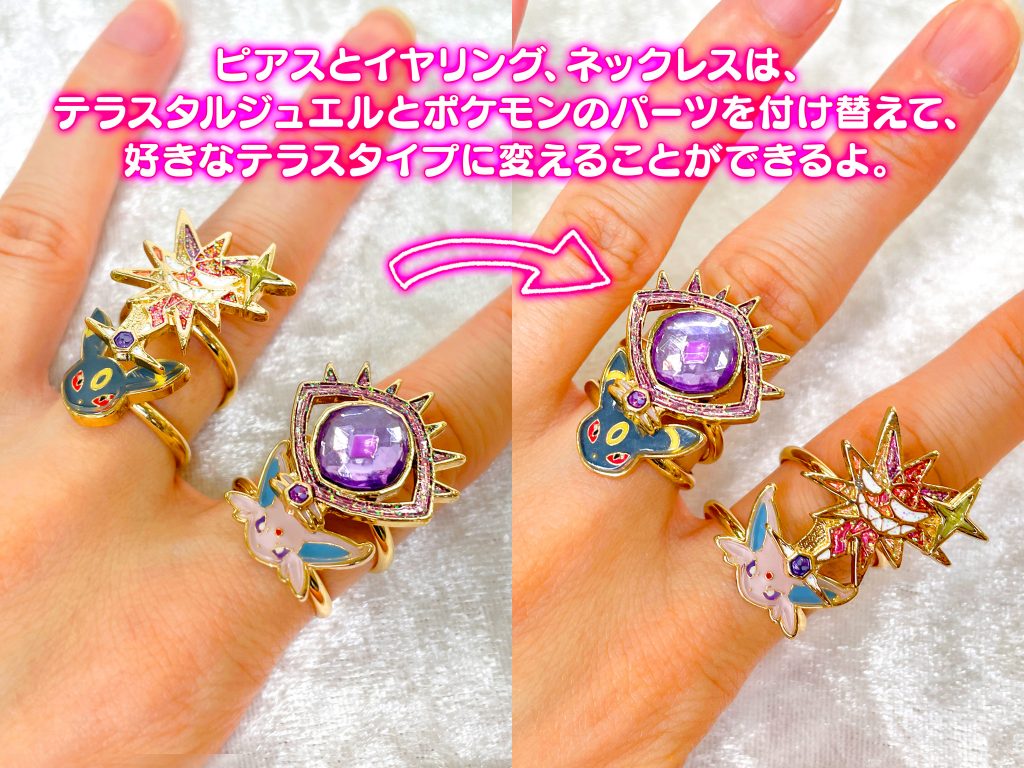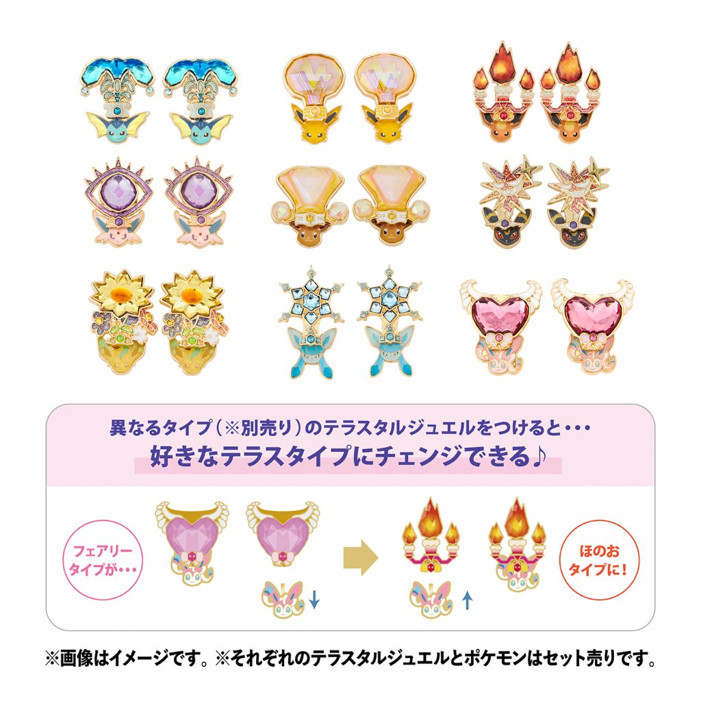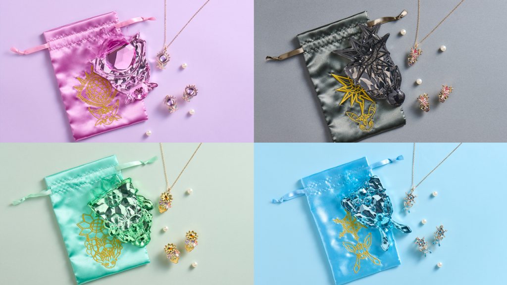 La collection comprend une sélection de boucles d’oreilles et colliers inspirés du phénomène « Téracristal » découvert dans la région de Paldea, qui brille comme un bijou.
