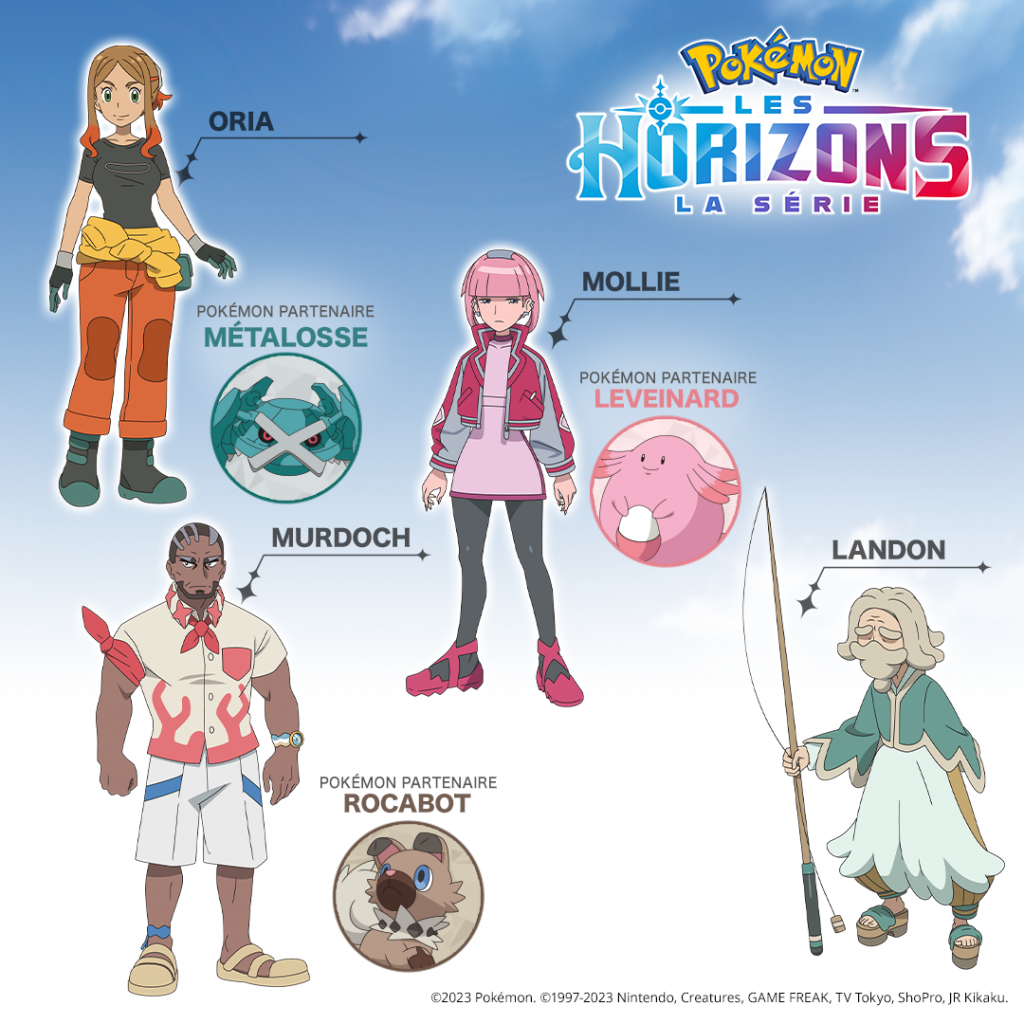 Dans La série : Pokémon, les horizons, Liko et son partenaire Pokémon Poussacha, ainsi que le second protagoniste, Rhod, rencontreront de nombreux personnages au cours de leur voyage, notamment un groupe mené par Friede et Capitaine Pikachu, appelé les Électacleurs Volants. Parcourant le monde des Pokémon à bord d’un dirigeable, les Électacleurs Volants compte parmi leurs rangs plusieurs personnages : Oria, qui aime la mécanique et les travaux d’électricité accompagnée de son partenaire Pokémon Métalosse, Murdoch, un passionné de cuisine et son partenaire Pokémon Rocabot, Mollie, spécialiste des soins, accompagnée de son partenaire Pokémon Leveinard, et enfin Landon. Liko et Rhod rencontreront également Amethio et son partenaire Pokémon Malvalame qui appartiennent à un organisme appelé les Explorateurs, ainsi qu’un streameur très populaire connu sous le nom de Nidotruc.