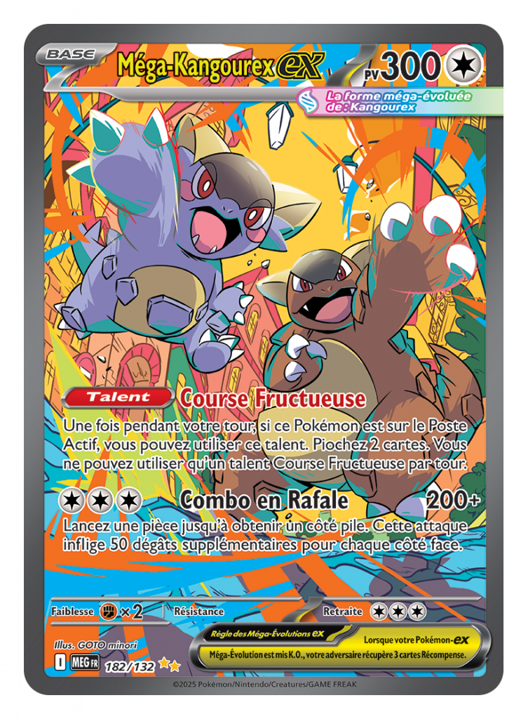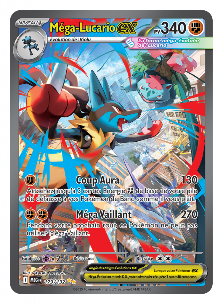 Voici les cartes AR de Méga-Lucario-ex, Méga-Kangourex-ex et Méga-Gardevoir-ex. Cette extension comprend également les cartes Bulbizarre, Herbizarre et Méga-Florizarre-ex. Lorsque vous positionnez ces trois cartes côte-à-côte, elles forment une seule et même image.