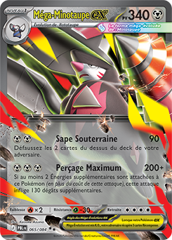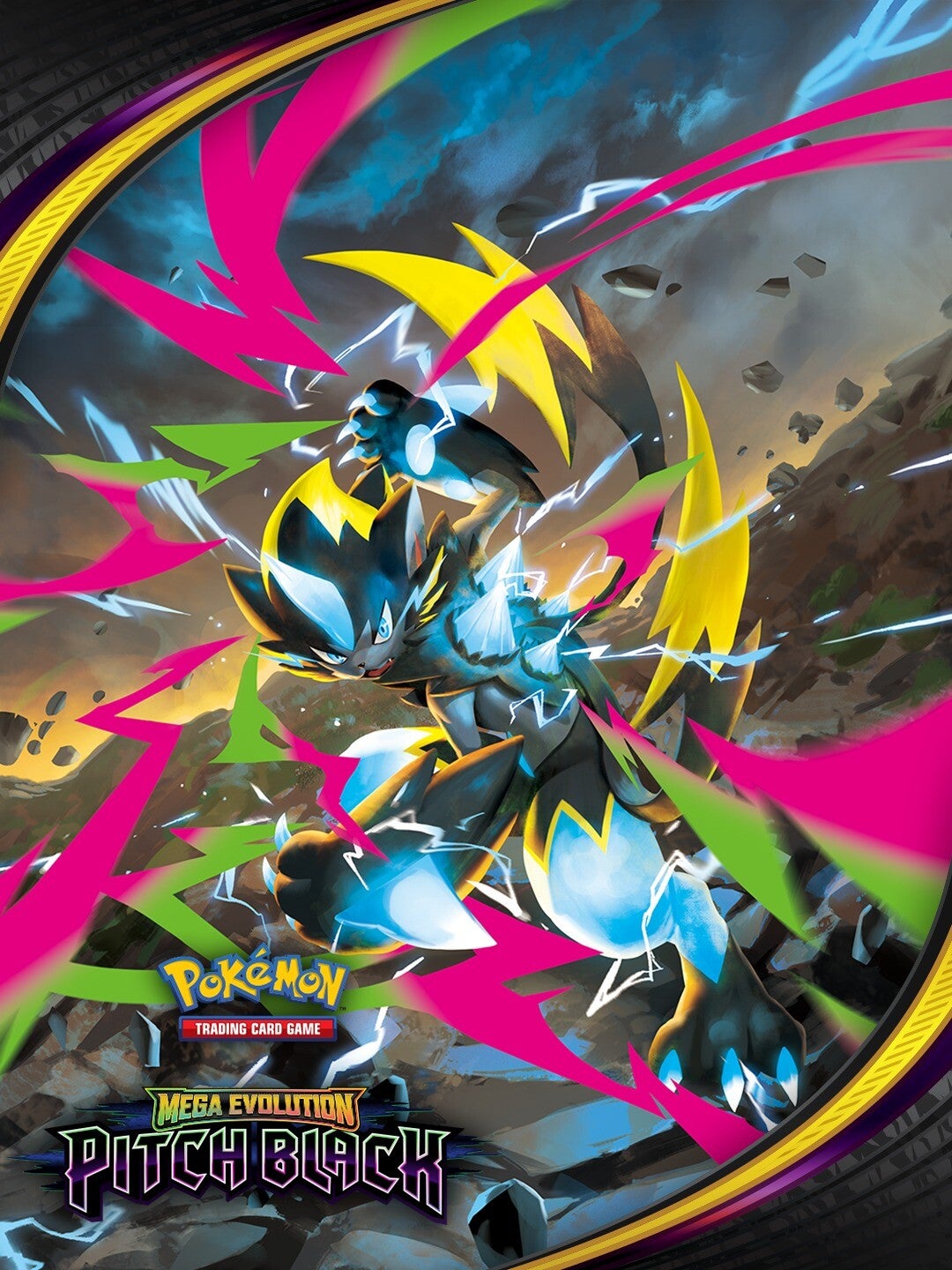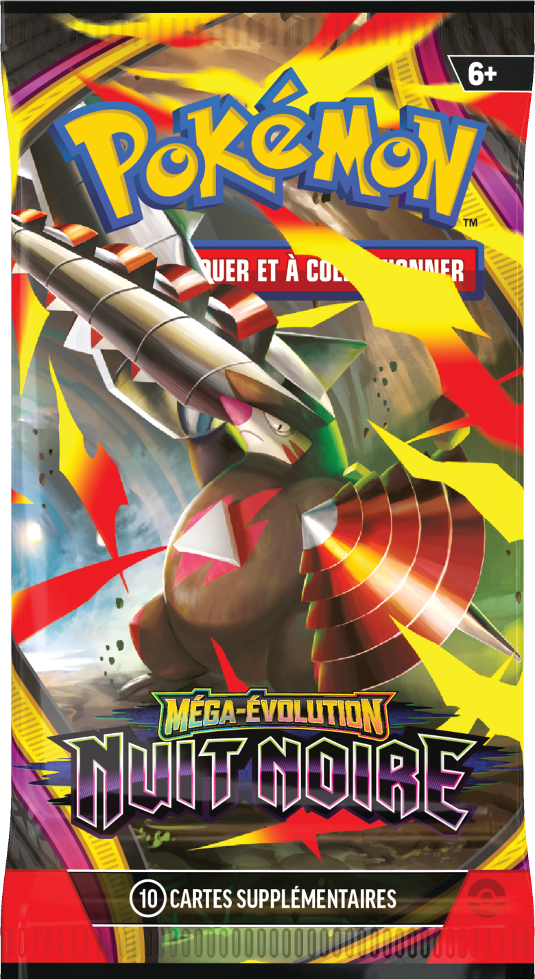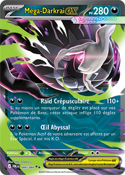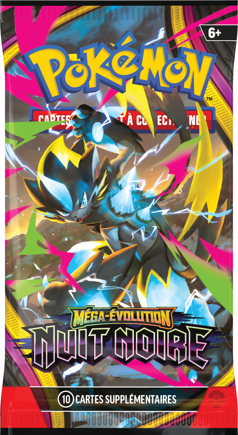 « Vous pourrez découvrir de nouvelles cartes, notamment Méga-Darkrai-ex, sortant de l’ombre avec une prestance menaçante, et Méga-Zeraora-ex, prêt à contre-attaquer d’une manière fulgurante. Cette extension contient également Méga-Lugulabre-ex et Méga-Minotaupe-ex, chacun permettant de mettre en avant des stratégies dynamiques et des combats palpitants. »