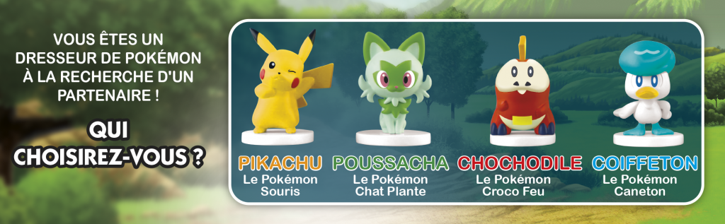 - 4 pions inspirés des personnages Pokémon. Les joueurs peuvent choisir leur compagnon d’aventure parmi 4 pions Pokémon : Poussacha, Chochodile, Coiffeton et Pikachu.