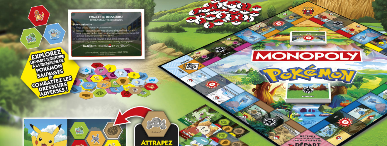 Dans cette édition Pokémon du Monopoly, les emblématiques billets laissent place à des Poké Balls et les propriétés traditionnelles deviennent des lieux mythiques à explorer pour attraper des Pokémon. Affrontez vos adversaires dans une course palpitante pour devenir le meilleur Dresseur, contrôler et explorer les lieux légendaires et constituer l’équipe ultime. Disponible en France dès la mi-janvier, Monopoly Pokémon vous attend dans les magasins spécialisés, les grandes enseignes et en ligne au prix conseillé de 29,99 euros.