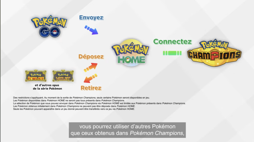 Le jeu Pokémon Champions sera compatible avec Pokémon HOME. Il sera donc possible de transférer certains de vos compagnons venant des jeux principaux. Nous pouvons nous attendre à pouvoir transférer les Pokémon aperçus lors du Pokémon Presents.