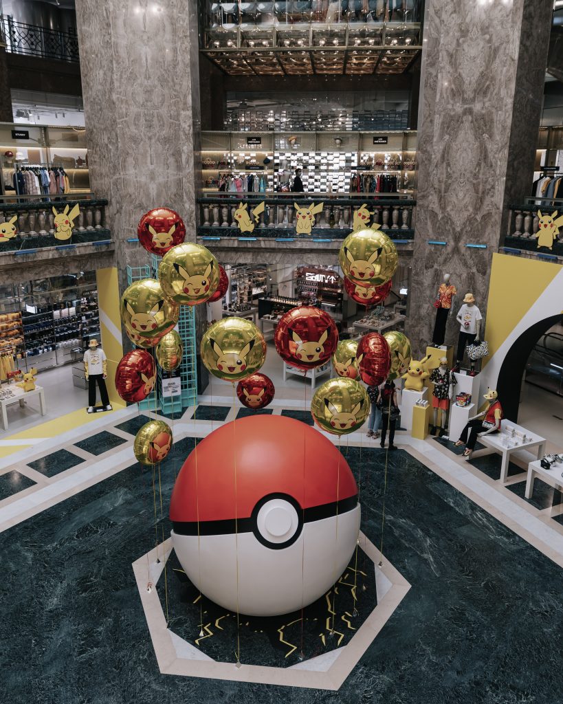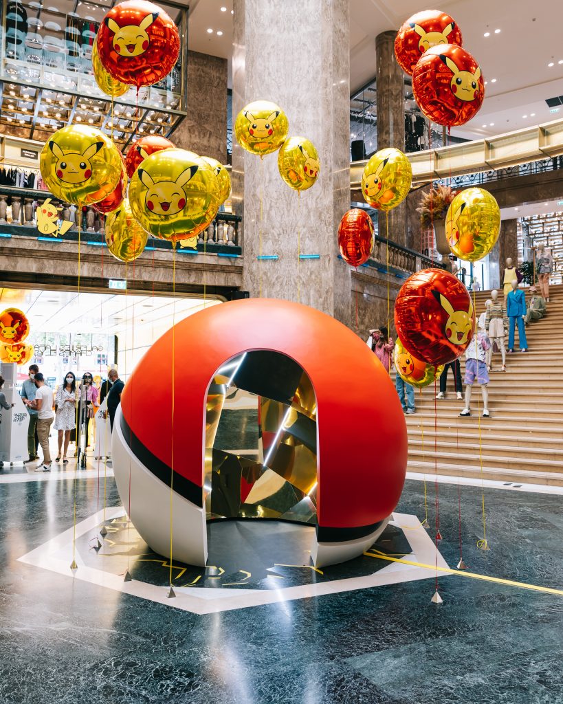 Le grand magasin a été entièrement mis aux couleurs de Pokémon. La façade, le tunnel lumineux et l’atrium, tout l’espace est une immersion visuelle aux couleurs inspirées de la marque Pokémon. Une Poké Ball géante trône au centre de l’atrium sous la coupole Art Déco. Elle propose une expérience unique avec un jeu de miroirs et de lumières qui offrent mille possibilités pour se prendre en photo.