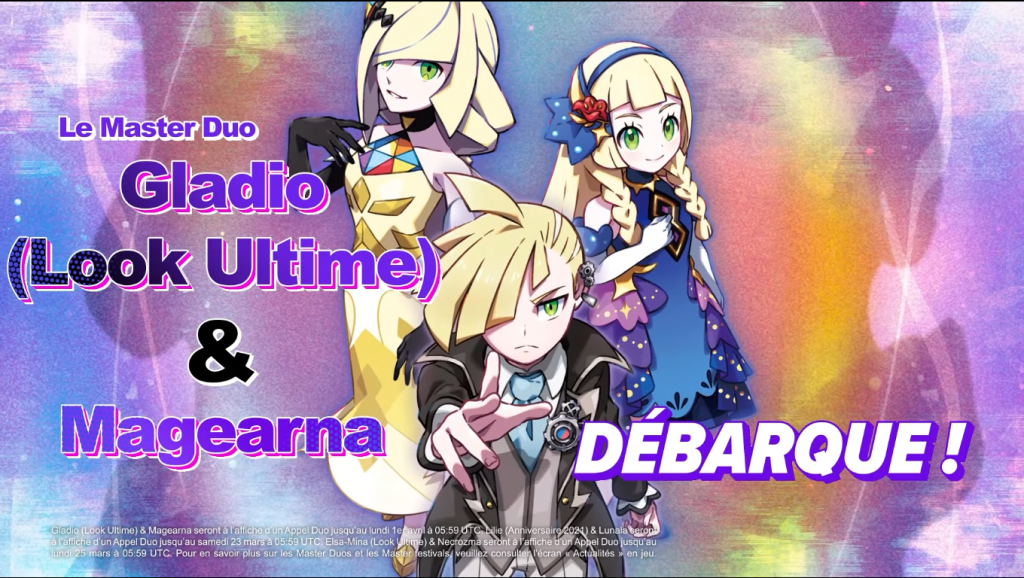 Ensuite, vous pouvez aussi obtenir le Master Duo Gladio (Look Ultime) accompagné de Magearna jusqu’au lundi 1er avril dans les Appels Duo.