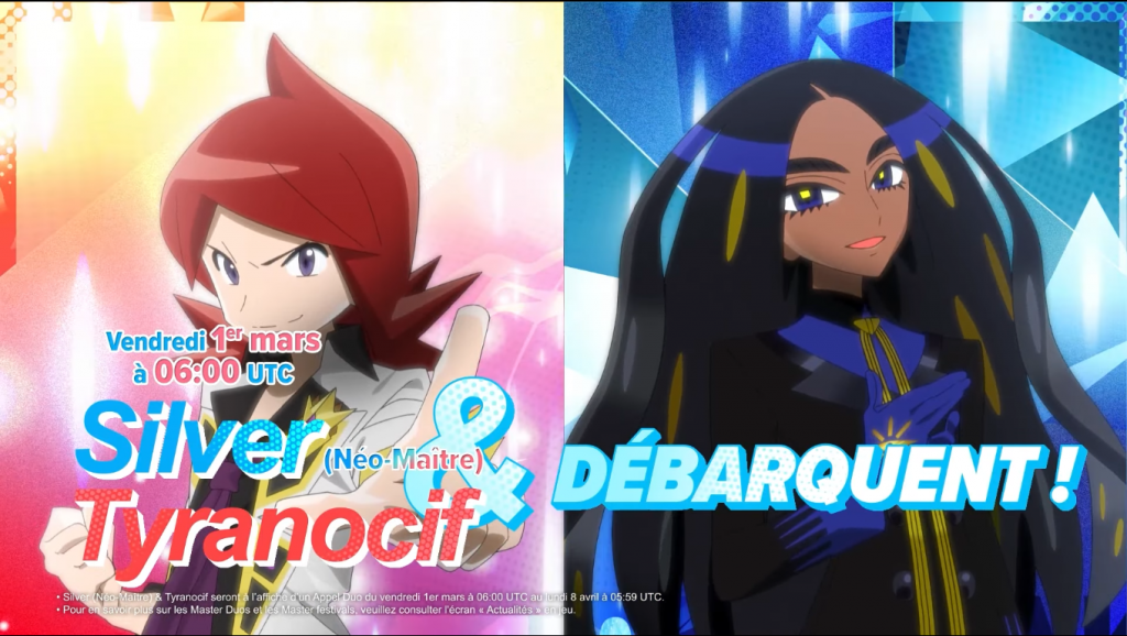 Quant à la deuxième information diffusée lors de ce Pokémon Présent, Silver fait son entrée, accompagné de Tyranocif. Ils sont un Duo Attaquant de type Roche avec Accélérateur comme Rôle EX. Vous pourrez les obtenir à partir du vendredi 1er mars à 7h.