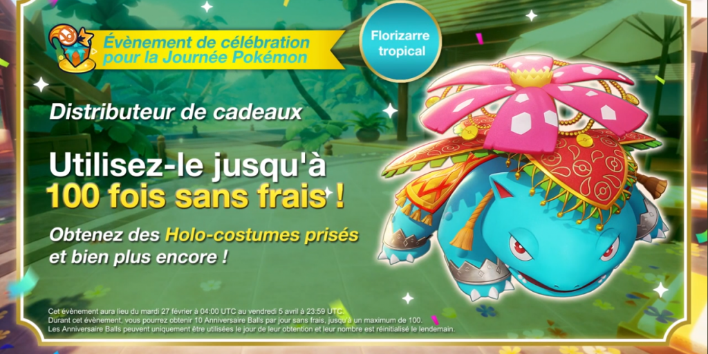 Pour fêter la Journée Pokémon, vous pouvez utiliser 10 fois par jour (+ les 2 habituels) le distributeur de cadeaux. Si vous avez de la chance, vous pourrez obtenir des Permis Unite !