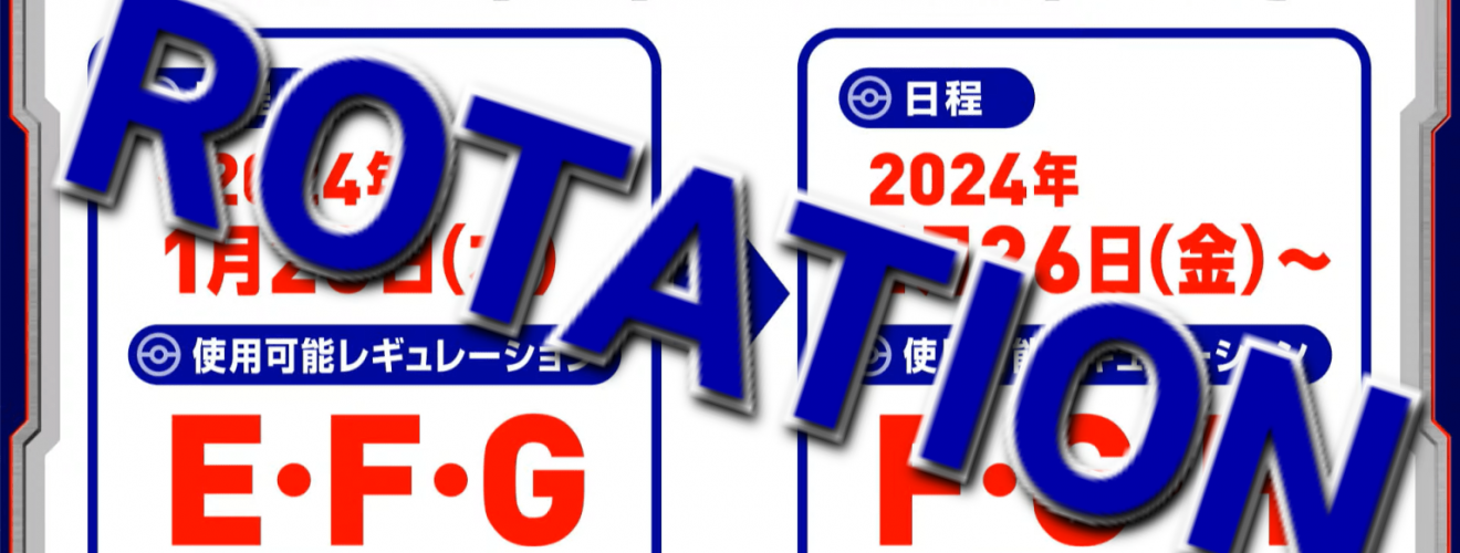 A partir du 26 janvier 2024 au Japon, le jeu effectuera une rotation pour passer des lettres E-F-G à F-G-H. Donc il faudra utiliser les cartes portant les lettres F-G-H dans les futurs decks au format standard.