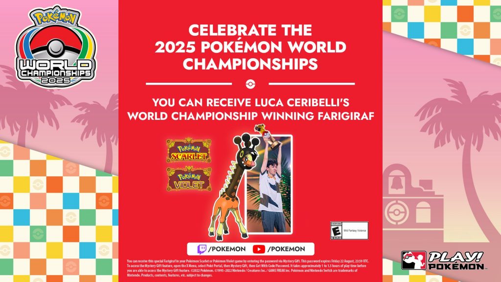 Suivez la diffusion des Championnats du Monde 2025 pour découvrir un mot de passe à entrer dans le menu « Cadeaux Mystère » de votre jeu Pokémon Écarlate ou Pokémon Violet. Celui-ci vous permettra de recevoir la Farigiraf de Luca Ceribelli. Ce Farigiraf spécial possède les mêmes capacités et stats que celle de Luca, alors pourquoi ne pas l’ajouter à votre propre équipe compétitive ?