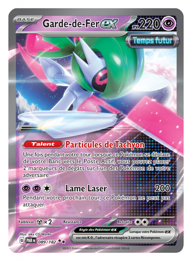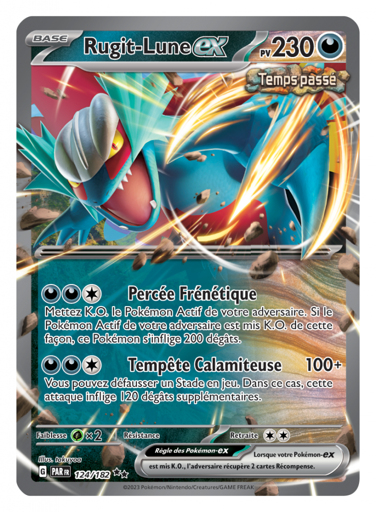 Inspirée par les Pokémon Paradoxe des jeux vidéo Pokémon Écarlate et Pokémon Violet, l’extension Écarlate et Violet – Faille Paradoxe introduit les Pokémon Temps passé et Temps futur ainsi que des cartes Dresseur, comme dévoilé récemment pendant les Championnats du Monde Pokémon 2023. Les Pokémon Temps passé, qui incarnent l’endurance et la puissance, disposent en général d’attaques directes qui infligent de nombreux dégâts, et il est plus difficile de les mettre K.O. Maîtrisant la vitesse et la technique, les Pokémon Temps futur ont des talents et des attaques dont les effets supplémentaires permettent d’élaborer des manœuvres astucieuses et des stratégies ingénieuses. De plus, les cartes Dresseur Temps passé soutiennent en général les Pokémon Temps passé, tandis que les cartes Dresseur Temps futur soutiennent les Pokémon Temps futur.