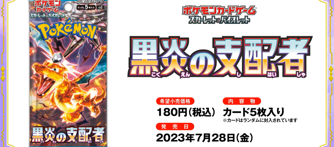 La troisième extension Scarlet & Violet SV3 Ruler of the Black Flame a été dévoilée lors de la diffusion des Championnats du Japon 2023. Elle sortira le 28 juillet au Japon et contiendra 108 hors cartes secrètes.