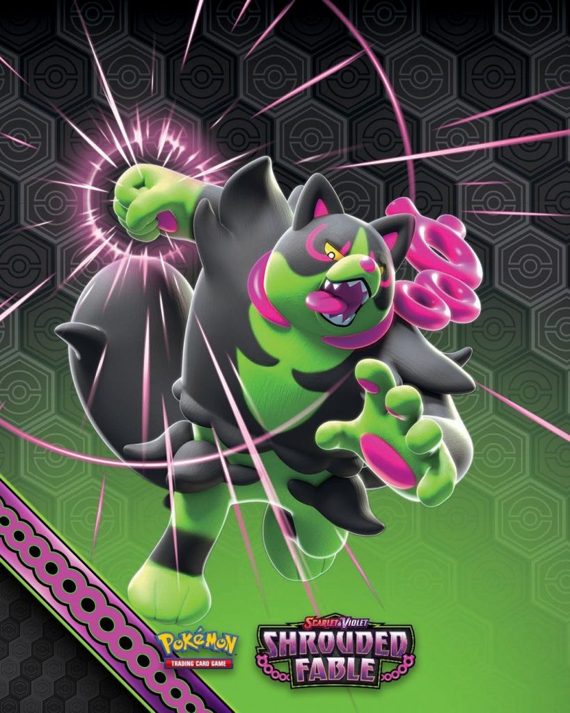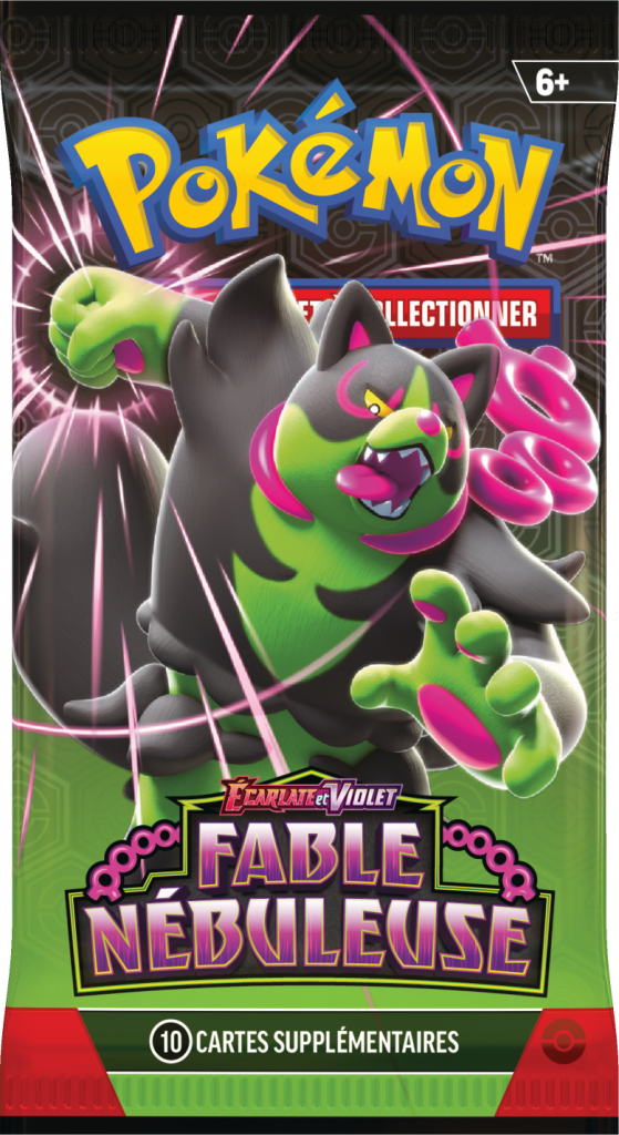Contenu : 2 boosters Écarlate et Violet – Fable Nébuleuse, une page d’autocollants et une carte artistique assortie à la boîte avec Noctunoir, Zoroark, Félicanis, Fortusimia ou Favianos.