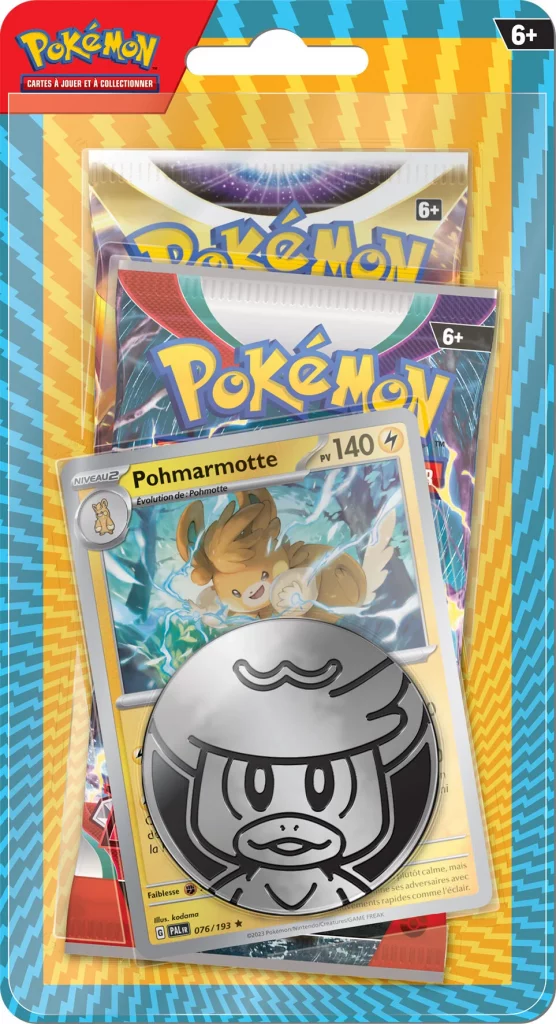Contenu : 7 cartes promotionnelles Pikachu Poussacha ex Pohm Pohmotte Pohmarmotte ex Compagnol et Famignol ex, 1 planche d’autocollants, 1 mini-portefolio, 1 jouet Pikachu, 6 boosters du JCC Pokémon, 1 carte à code pour Pokémon JCC Live.